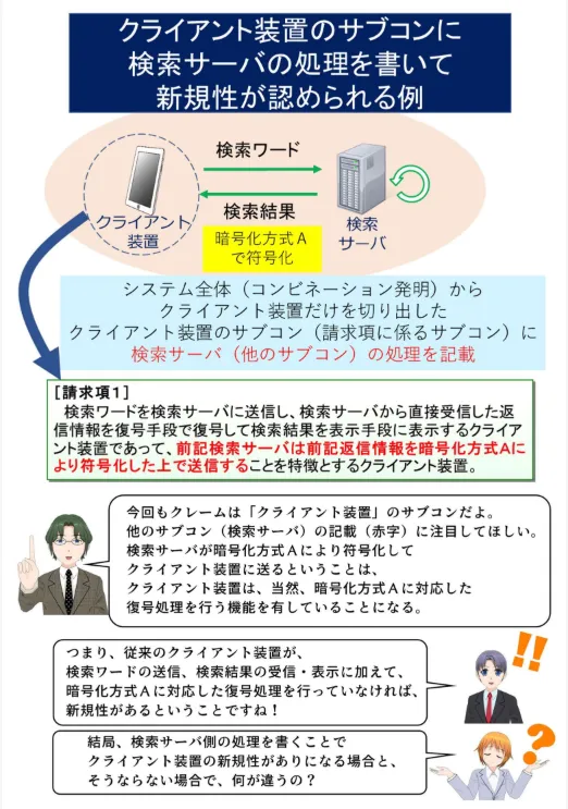 例えば、検索サーバーの処理だけを追記して、処理等に何ら特徴のないクライアント装置として出願した場合、クライアント装置自体に新しい技術がなく新規性が認められません。