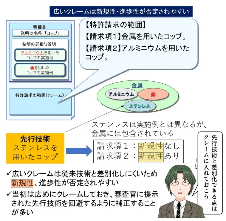 その状態で「アルミニウムのコップ」という発明を出願した場合、ステンレス製コップとは材料が異なるため、新規性を有すると評価される可能性があります。